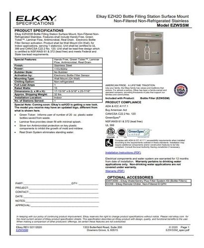La estación de llenado de botellas Elkay EZH2O® ofrece un llenado rápido y limpio de botellas de agua y mejora la sostenibilidad al minimizar nuestra dependencia de las botellas de plástico desechables. Estación completa con de llenador de botellas y bebedero en un diseño consolidado que cumple con las normas ADA. El llenador de botellas cuenta con activación de sensor sanitario sin contacto con temporizador de apagado automático de 20 segundos.
